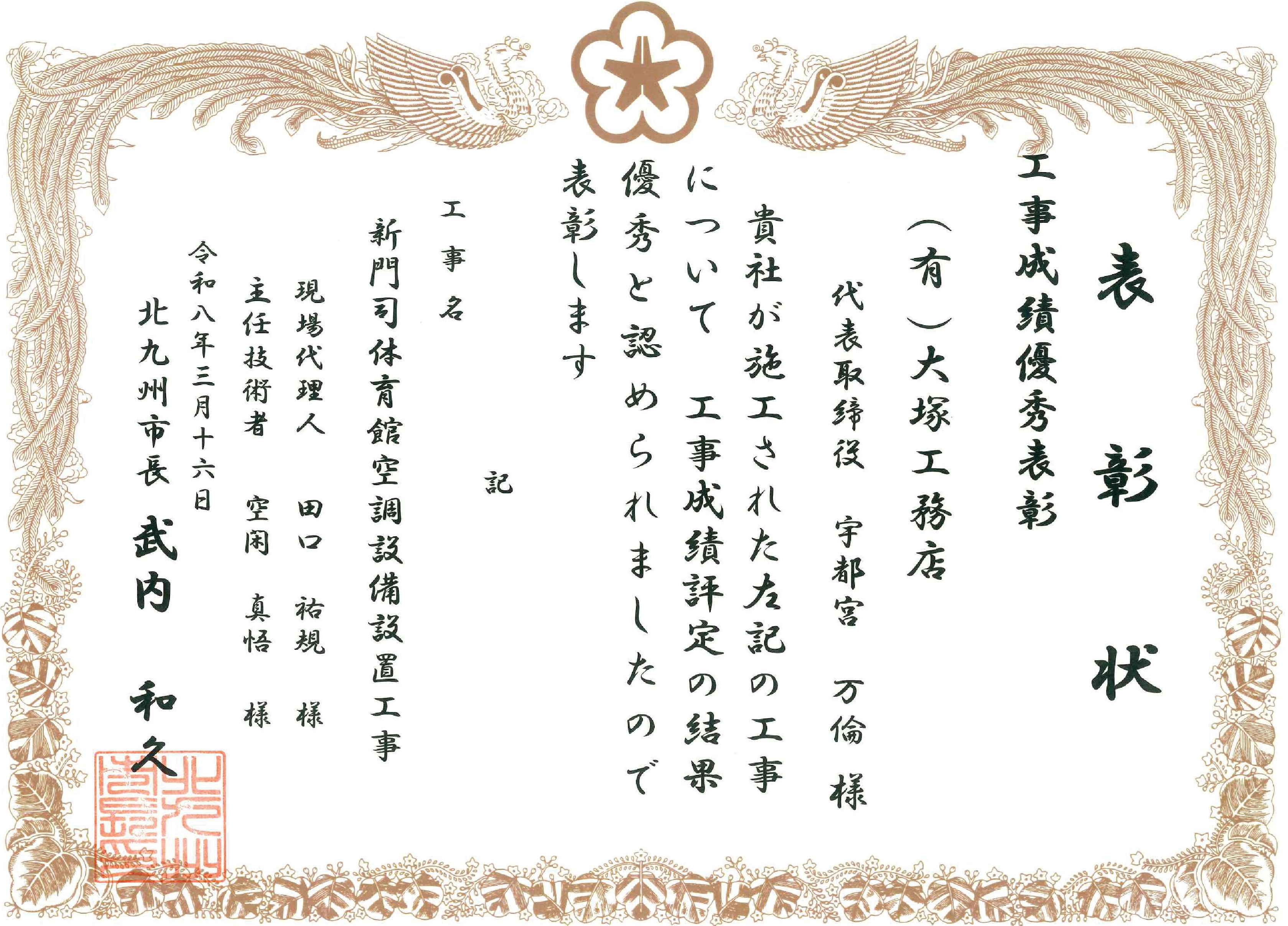 北九州市より弊社の技術力について評価をいただき、「工事成績評定」で7度の優秀賞をいただいております。